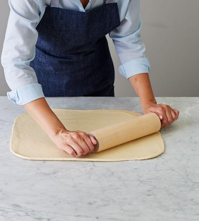 Тестото се раздърпва или разточва от центъра към краищата на кора към 45х35 см.