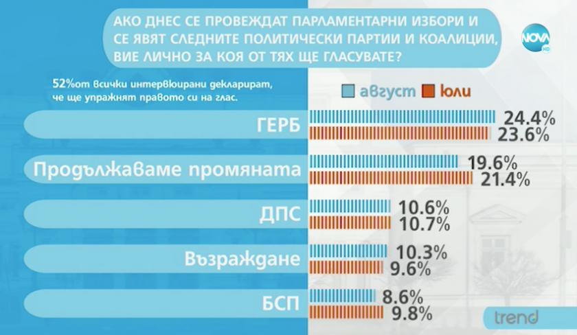 Проучването на „ Тренд “ е по поръчка на вестник „ 24 часа ", отдадено на настройките на българите по отношение на главните проблеми в страната и поддръжката към политическите обединения. Изследването е осъществено в интервала сред 15 и 22 август 2022 година посредством директно полустандартизирано изявление „ лице в лице ” с таблет измежду 1007 души на възраст 18+.