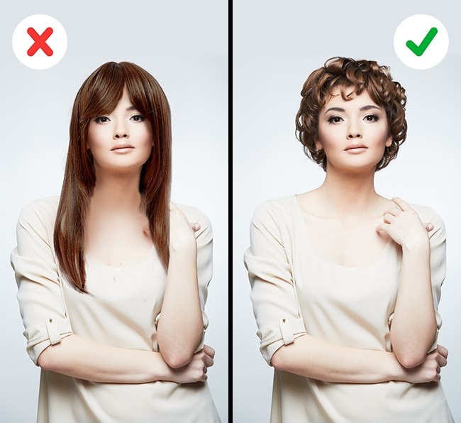 Големите и бурни прически могат да доведат до дисбаланс на външния тип. Дайте преимущество на подстригването със междинна дължина или на дължина до рамото. Късите прически наподобяват добре, когато шията ви е скрита под косата, а косата покрай ушите е малко удължена.