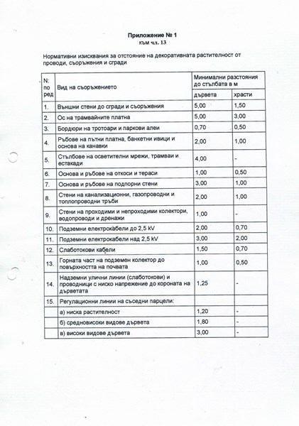 • Не бива да се подценяват и нормативните условия за разстояние на декоративната растителност от обекти в градска среда. За да оцелее младото дръвче, е належащо то е на задоволително разстояние от други дръвчета, здания и уреди, както и от кабели на енергопреносната мрежа
