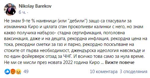" Не знам 9-те % наивници (или " дебили " ) за какво са дали своят вот за измамника Киро и цялата паплач прокопиеви калинки с него ", написа в профила си във " Facebook " Николай Бареков. " Ще изтъквам авера му Кокорчо в стеснен кръг какво е споделил оня ден " Киро е " на плик " ". Димек на корав хонорар кеш всеки месец бил Киро. И то не от оня ден, просто пликът надебелява с издигането в йерархията ", продължава той.