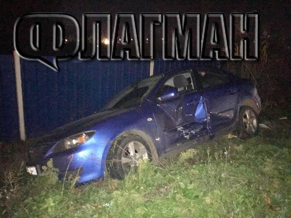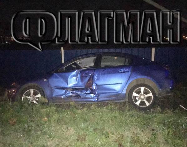 Маздата е с ударена от дясната страна, където шофьорската врата е съществено огъната. Другият участник в ПТП-то е сив Роувър, чиято задна част е станала на хармоника.