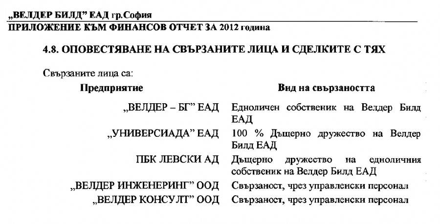 Справка в Търговския указател за свързани лица сочи, че притежателят на " Аероспециал 91 " Христо Георгиев е в Съвета на шефовете на " Велдербилд " ЕАД дружно с Васил Таков и Георги Драгомиров.