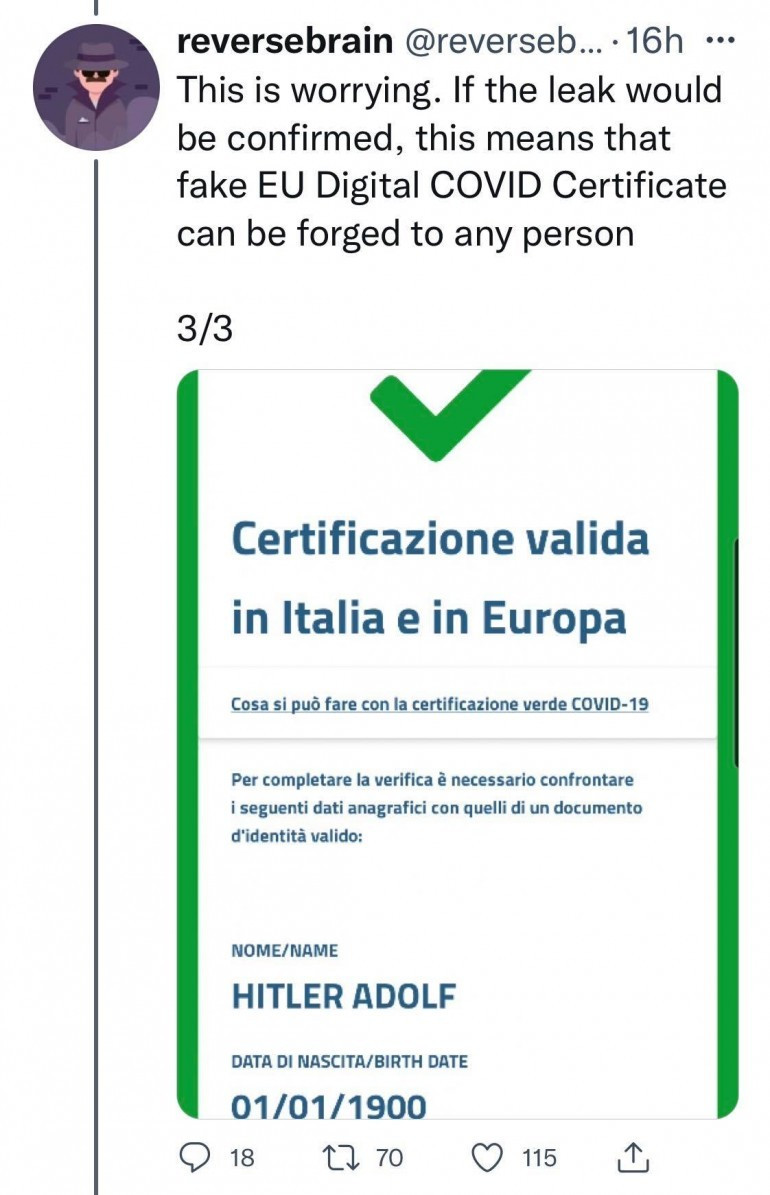 Според уеб страницата Zerozone.it историята е разкрита от потребителя Reversbrain, който през вчерашния ден към 22:30 ч. разгласява серия от туитове: " Мисля, че ключовете, употребявани за сключване на цифровия документ Covid EU, най-малко в Италия, са изтекли по някакъв метод ", написа той и приканва хората да сканират QR код с формалното италианско приложение. Кодът в действителност се оказва годен и в действителност е даден на Адолф Хитлер. Ако приключването на информация се удостовери, това значи, че документът EU Covid може да бъде подправен от всеки, написа потребителят. Тази заран той още веднъж повдигна тематиката след новината, че ключовете за генериране на пропуските в действителност са били откраднати, и съобщи, че документът към този момент не е годен. Според уеб страницата Zerozone документът сякаш е публикуван от френския орган " Cnam - Caisse Nationale d`Assurance Maladie " на 25 октомври 2021 година Друг подправен, само че годен QR код, още веднъж на името на Адолф Хитлер, роден на 1 януари 1930 година, демонстрира компанията " Janssen - Cilag international " като производител на имунизацията, прилагана в Полша от Centrum и Zdrowia. Изглежда, че всичко е тръгнало от полемика в " RaidForum " - уеб пазар, който се е трансформирал в място за продан на приключване на данни, написа Zerozone, където се спекулира, че е допустимо да е откраднат и частният ключ на полското държавно управление. На пръв взор наподобява, че частните ключове, употребявани за сключване на зелените пропуски - един тип щемпел, употребен за валидиране на документите, са откраднати. Решението би било инверсия на тези ключове, което би обезсилило всички генерирани пропуски, и повторното им стартиране в обращение ", споделя Стефано Занеро, професор по компютърна сигурност и криминалистика в Миланския политехнически университет. Експертът добавя, че QR кодът може да бъде манипулиран по разнообразни способи, даже ръчно от „ безсъвестен чиновник “ по време на въвеждането на данни, само че в този случай наподобява, че става въпрос по-скоро за смяна на частните криптографски ключове, които разрешават генерирането на годни зелени пропуски. Въпреки че случаите сега се отнасят до Франция и Полша, не можем да знаем мащаба на явлението, защото всяка страна съхранява свои лични ключове, нито размера на вредите, тъй като ключовете може да са били откраднати и преди няколко месеца, прецизира Занеро. Според специалиста, действието цели да се вдигне звук, защото подправените зелени документи са регистрирани на името на Адолф Хитлер - персонаж, който към този момент не е сред живите.