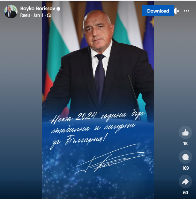 " Нека 2024 година бъде постоянна и сигурна за България ". С това сбито благопожелание водачът на ГЕРБ Бойко Борисов се обърна към почитателите си във Facebook точно на Нова година.