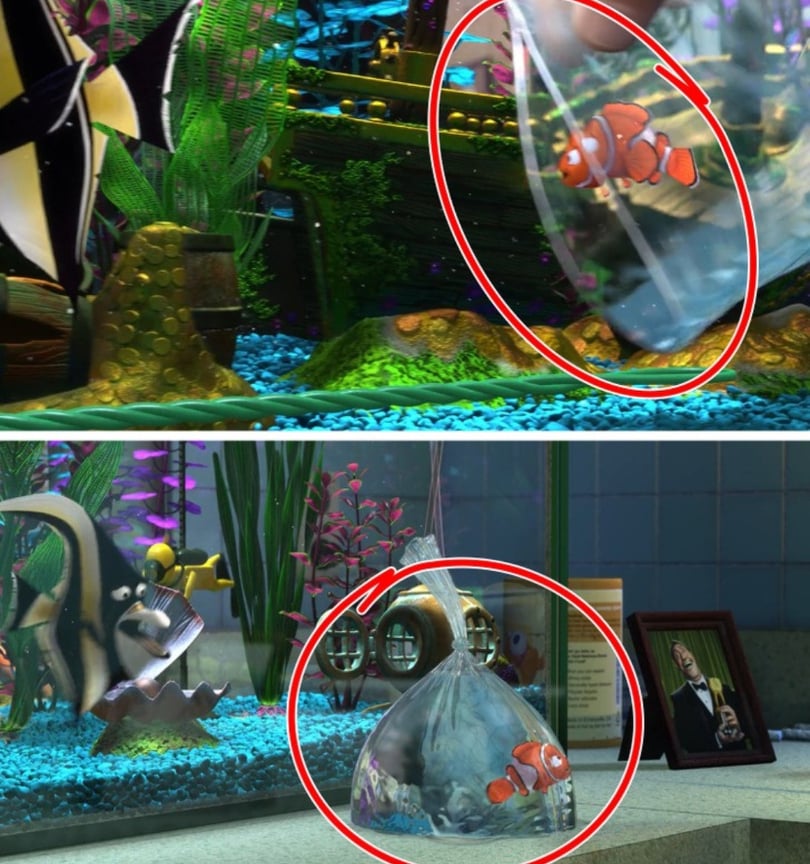 В един от най-напрегнатите моменти в „ Търсенето на Немо “ зъболекарят слага рибката в пликче. Това пликче в първия миг наподобява като закопчаващо се с цип, а по-късно – като нормално.