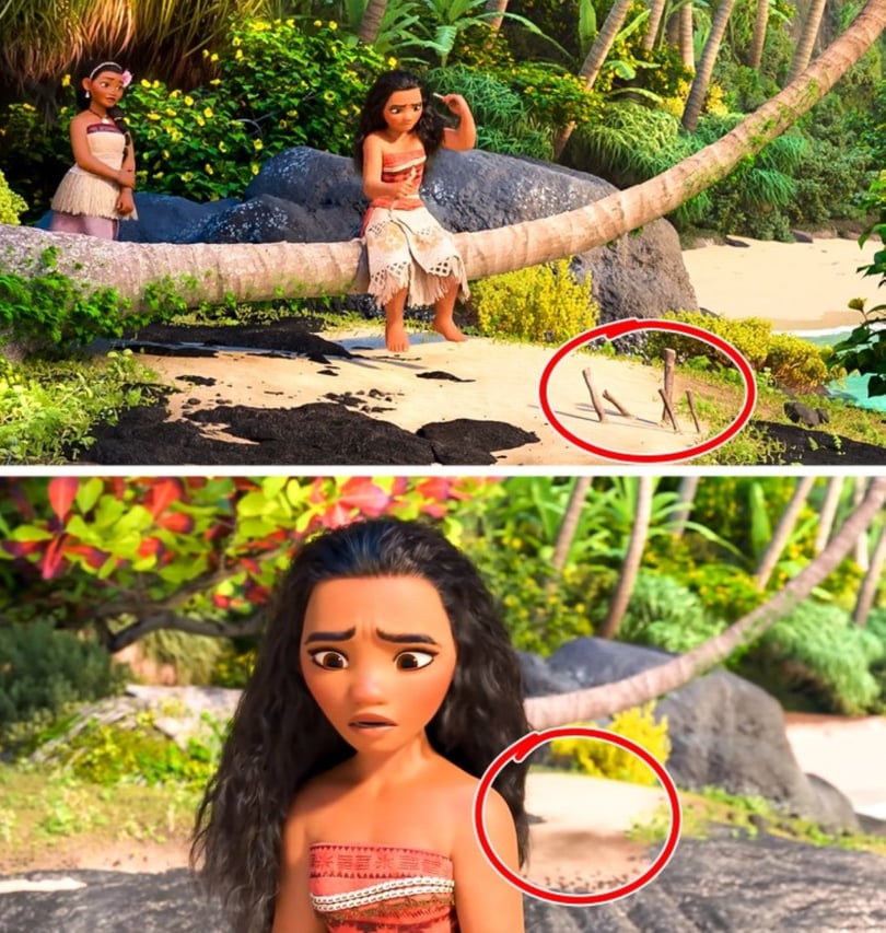 „ Моана “ е един от най-големите шлагери на Дисни през последните години. Една дребна неточност може да се види преди и по време оснояната ария „ How Far I`ll Go “. Преди да стартира да пее, Моана хвърля някои пръчки, които се забиват в пясъка, и когато запява песента, те изчезват.