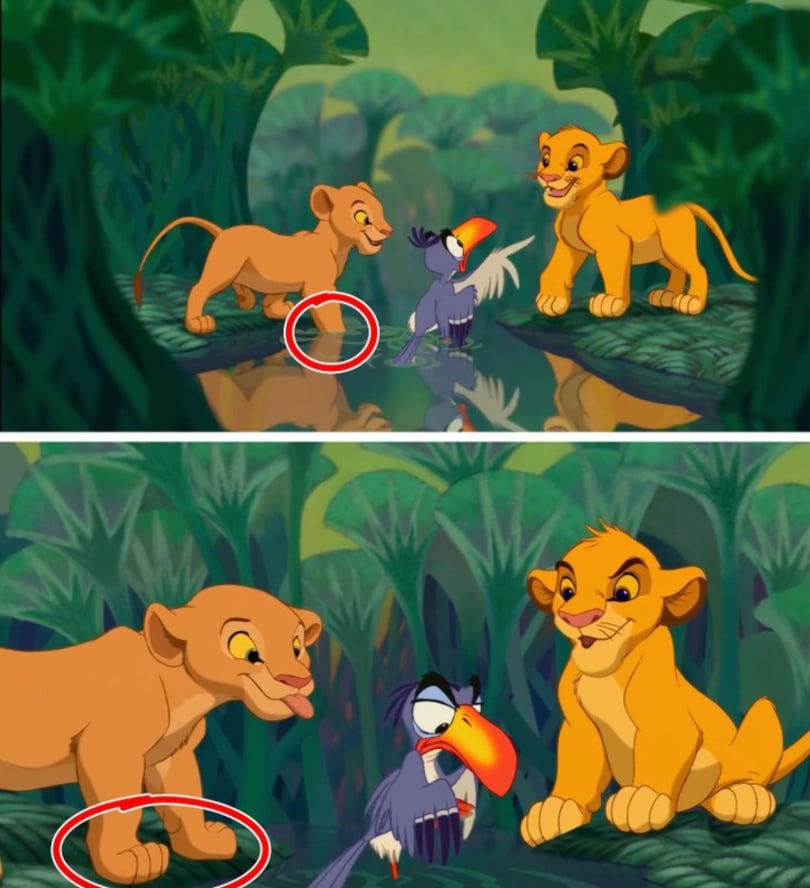 Въпреки че евентуално сте гледали анимацията за дребното лъвче най-малко два пъти, е допустимо да сте пропуснали един дребен подробност. По време на песента „ I Just Can`t Wait to Be a King “ Симба и Нала стартират да нервират и да вършат гримаси на Зазу. В този миг лапите на Нала попадат във водата, но в идващия кадър ги виждаме крепко стъпили на тревата.