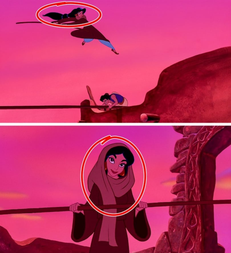„ Аладин “ е измежду най-хитовите филми от златната епоха на Дисни - 90-те години. И даже да сте гледали анимацията безчет пъти, може да сте пропуснали една дребна неточност в сцената с първата среща сред Жасмин и Аладин - когато принцесата скача от една постройка на друга. Когато прави скока, виждаме косата ѝ пусната, а когато отново влиза в кадър, още веднъж е с качулка.