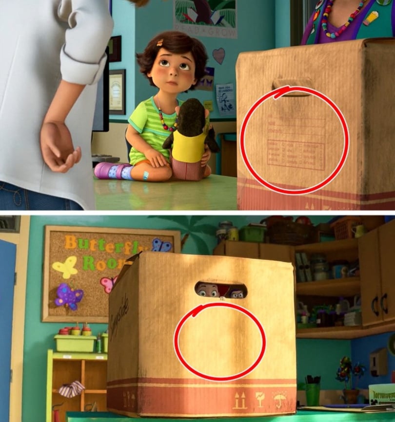 Това филмче е едно от огромните достижения на взаимната работа на Pixar и Дисни и на практика е съвършеният свършек на трилогията (въпреки че по-късно прибавиха още една част). Когато майката дава на Моли кутията за дарения, в която са играчките, тя изписва „ Sunnyside “ от едната ѝ страна. Когато кутията е в колата, а след това и в детската градина, в профил, под отвора има напечатан надпис. Когато майката на Бони оставя кутията в стаята на пеперудите, този надпис към този момент е липсващ, а по-късно се появява още веднъж.