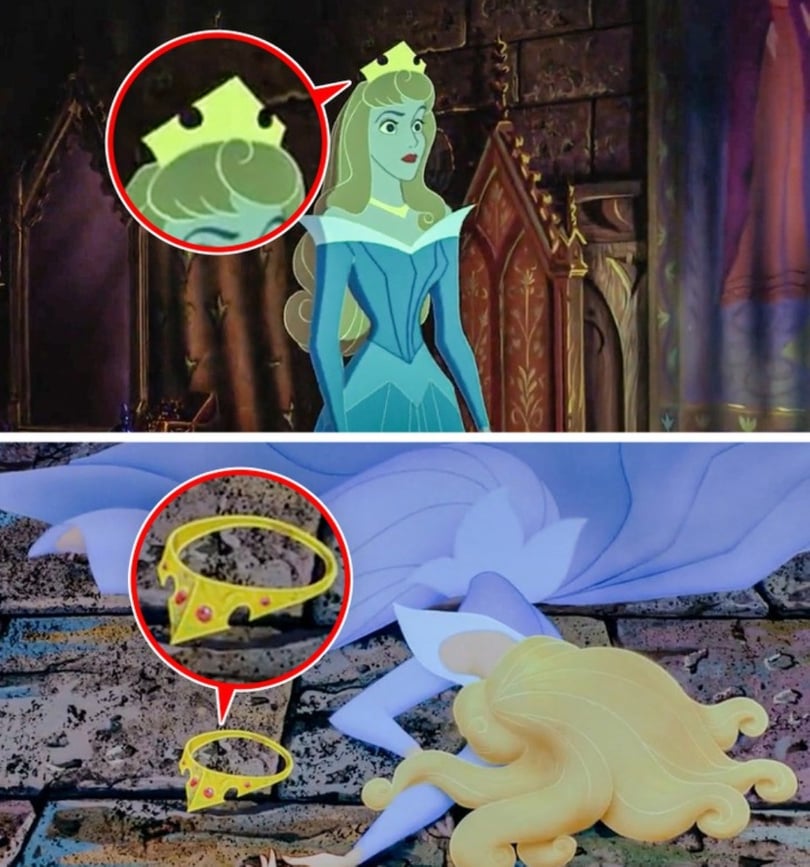 Една от най-важните подиуми в „ Спящата хубавица “, е, когато Аврора попада в плен на магията на злата вълшебница Малефисент, поставяйки пръста си върху вретеното. Преди да падне и да заспи, принцесата носи изцяло гладка корона. Секунди по-късно обаче тя наподобява покрита със скъпоценни камъни.
