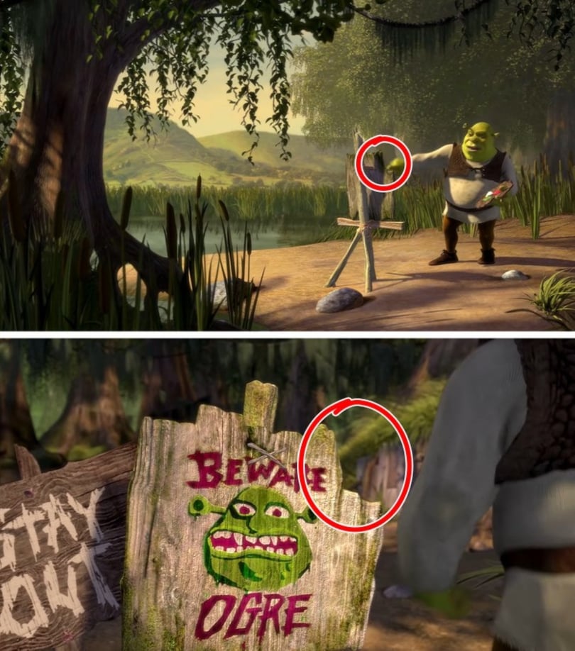 В началото на кино лентата се срещаме с Шрек – страшното страшилище, което желае единствено да го оставят намира и избира да всява смут у всички. Около блатото му има знаци с предупредителни надписи, че всеки би трябвало да се пази. Една дървена табела с надпис „ Пази се от огрето “ наподобява е счупена в горния десен ъгъл, само че когато същата влиза в кадър откъм задната ѝ част, счупеният борд към този момент е отляво.