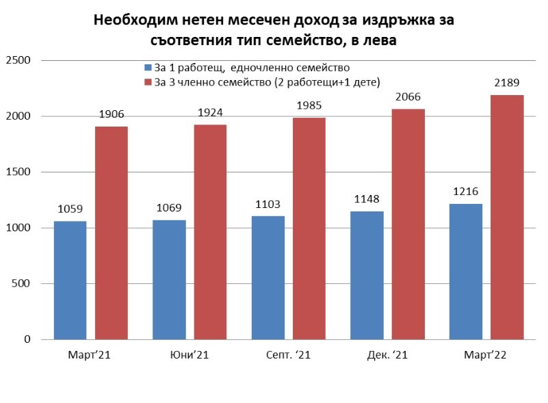 Необходимият чист месечен приход за прехрана на едно работещо лице от едночленно семейство доближи през месец март до 1216 лева. Тази стойност, образувана на базисна потребителска кошница, е нужна за покриване на разноските за прехрана на едно работещо лице, живеещо единствено, за храна, жилище, обучение, опазване на здравето, облекло, превоз и известия, развлечения и отмора. За едногодишен интервал разноските за прехрана на живота на 1 работещо лице нараства с 157 лева, като от тях групата на питателните артикули нараства с 69 лева, а на нехранителните артикули и услуги с 89 лева