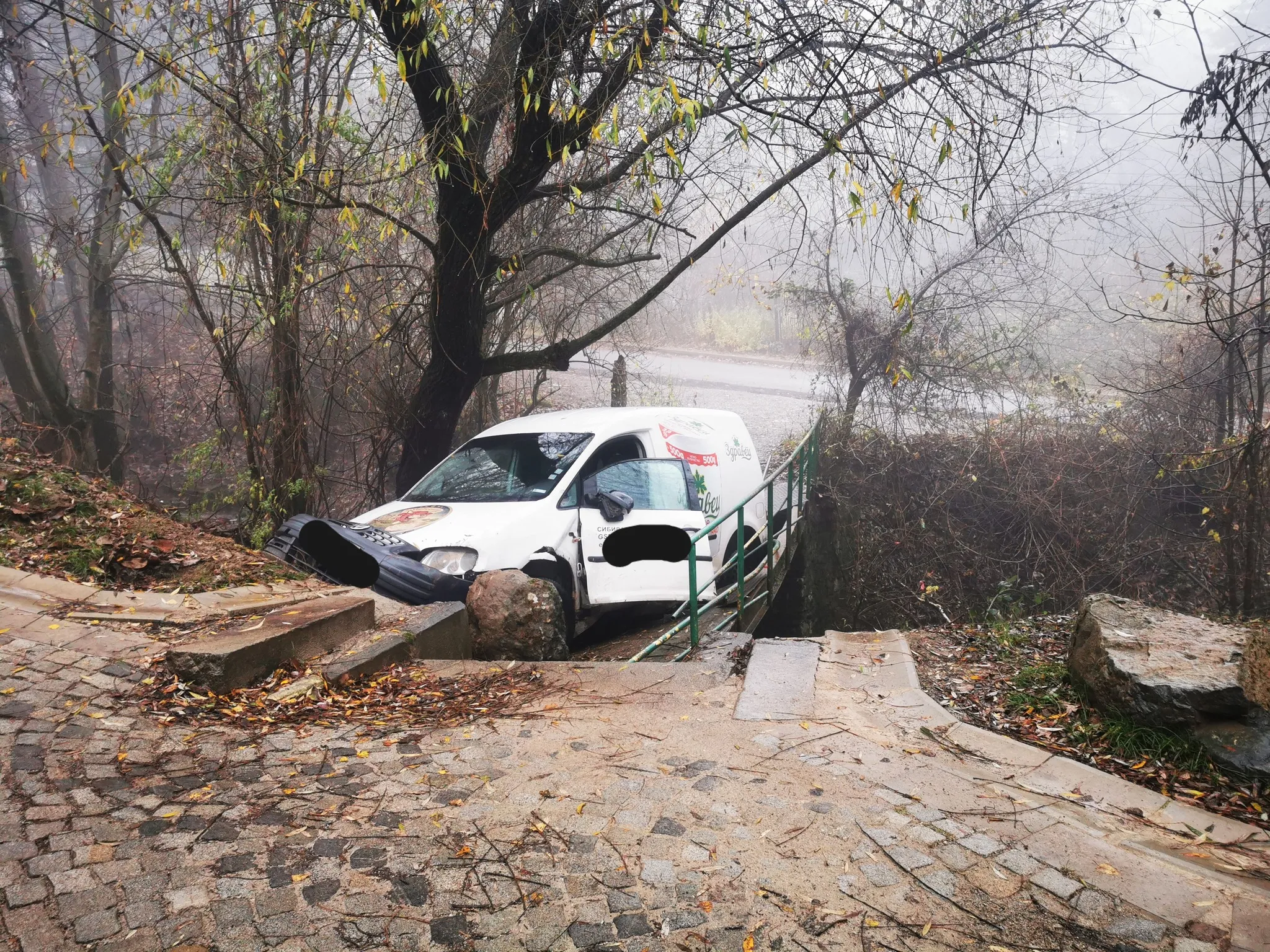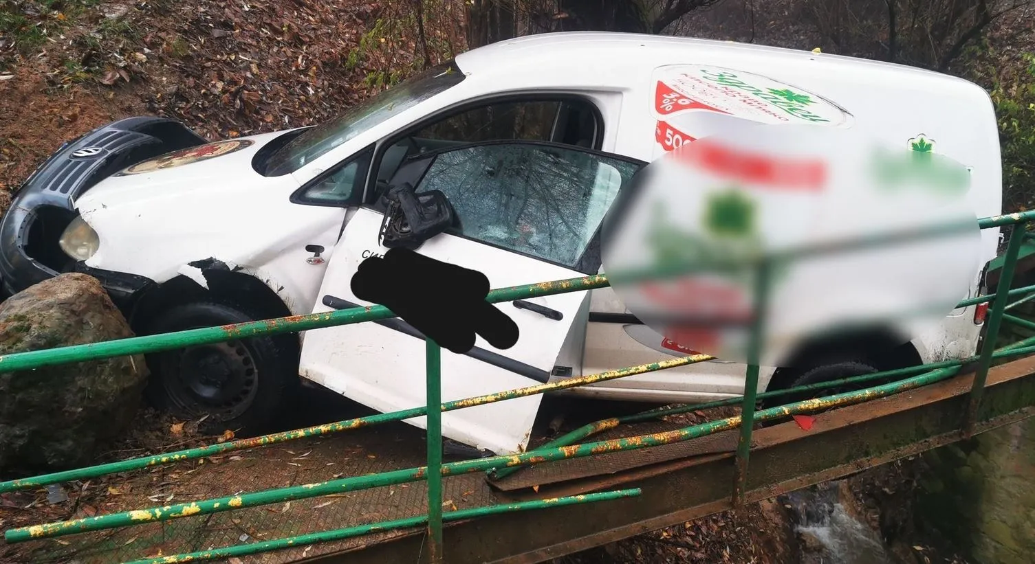 Потрошени са броните му, провали има по калниците и огледалата. Машината е заседнала в моста, по който има съществени материални провали.