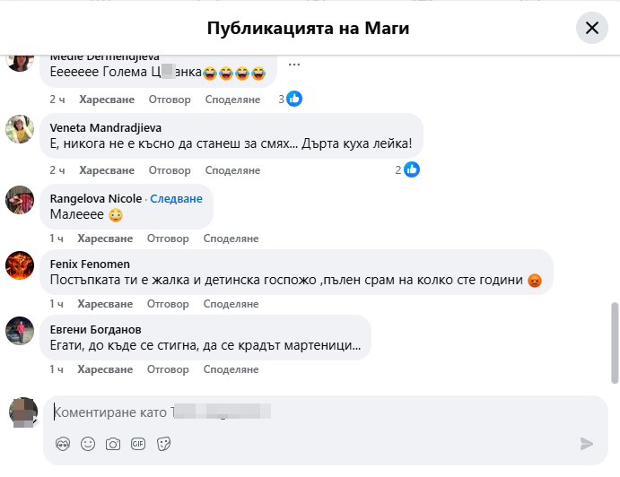 Случаят провокира лавина от мнения на възмутени консуматори. Desislava Wolf дефинира постъпката като „ тъпа “ и прикани дамата да се засрами и да върне мартеницата. „ Е, в никакъв случай не е късно да станеш за смях “, добави Венета Мандраджиева. „ Постъпката ти е жалка и детинска, госпожо! Пълен позор “, написа Fenix Fenomen.