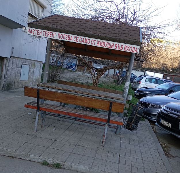 За да са изцяло предизвестени останалите, на друга табела се мъдрел подобен надпис: " Беседката е разполагаем единствено за живущите във входа ".