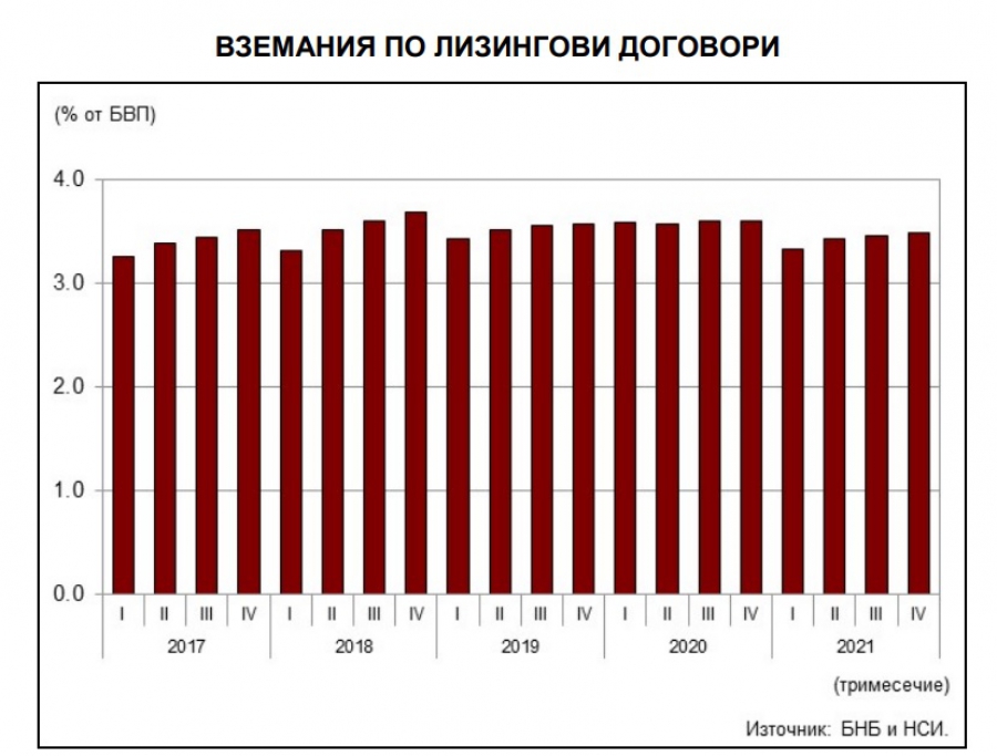 Вземанията съответно по финансов лизинг доближават 4.351 милиарда лв., като регистрират покачване от 6.4% (263.2 млн. лева.) на годишна база.