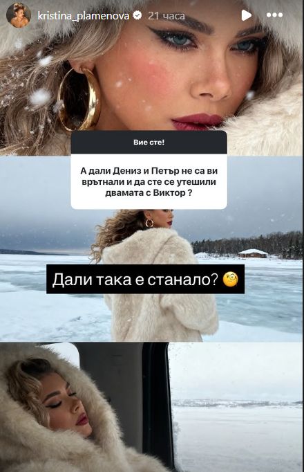 Спекулациите, че сред Кристина и Виктор може да има сантиментална връзка след края на предаването, стават все по-упорити. Причината – загадъчни сторита, в които двамата наподобява са на едни и същи места, едновременно. Освен това, от няколко източника към този момент се появиха изказвания, че са били видяни в столично заведение в изключително близка компания.