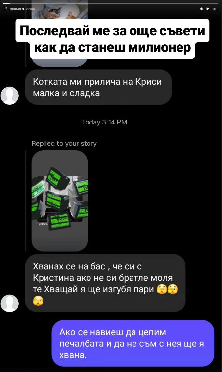 Интересното е, че и Виктор реши да се включи в размяната на подмятания. Той показа скрийншот от диалог с почитател, който му признава, че е заложил пари на това, че Виктор и Криси са двойка.