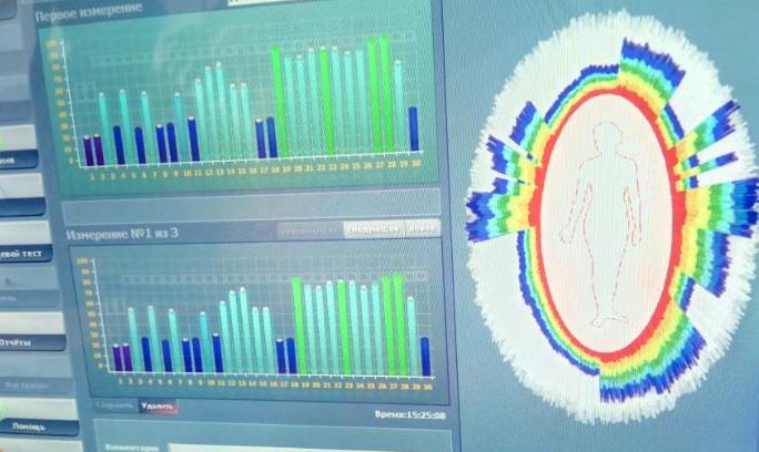 Изображение на работата на енергийните центрове - единствено първа и втора чакра работят добре. Синият цвят (вляво) означава сериозен недостиг на сила. Първото устройство сподели, че множеството от енергийните ми центрове не работят – единствено първа и втора чакра действаха и цялостта на аурата ми беше съществено нарушена. След това фамилният ни другар пусна другото устройство, което да усъвършенства здравословното ми положение. Поне по този начин се очакваше. Но резултатът бе незабележим и стана ясно, че евентуално имам хронични заболявания, които би трябвало да се лекуват най-малко 3 месеца. Тъй като съм деен човек, тази вероятност по никакъв начин не ми хареса, признавам.