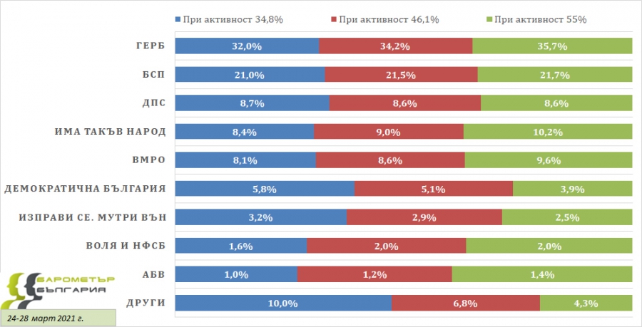Дори и при сюжет с ниска изборна интензивност водещи позиции ще има ГЕРБ с поддръжката на 32% от интервюираните. При повишение на интензивността партията ще усъвършенства резултата си с капацитет да доближи 35,7%, привличайки както част от гласоподавателите, които през последната една година се бяха отдръпнали от тях, по този начин и вота на тези, които гласоподават за спечелилите – присъстващи във всички избори.