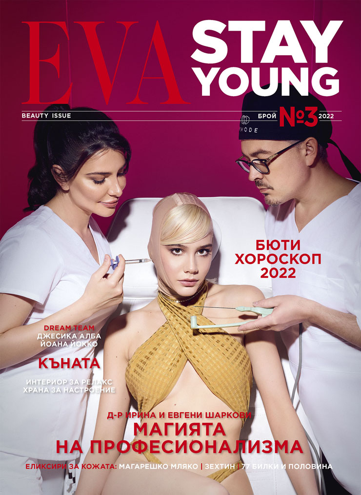 В особено обозначените броеве 2 in 1, които са на цена 10 лева, ще откриете вложено и тематичното ни издание EVA STAY YOUNG – 80 страници, отдадени на хубостта, здравето и положителната форма, цялостни с забавни истории. Ще прочетете за какво кожата ни обича зехтина, къната и магарешкото мляко, да, тъкмо по този начин, и него. Представяме доктор Енджи Касабие, Сами Хосни, Йоана Йокко и още имена с отношение към бизнеса с хубостта и здравето. Ще научите каква е връзката сред известна козметична марка и валдорфските учебни заведения. И, несъмнено, ще се запознаете с последните трендове в региона на козметологията и естетичната медицина, на която са се посветили и хедлайнерите на изданието – доктор Ирина и Евгени Шаркови, лицата от провокативната ни корица с присъединяване на една от звездите от диамантения ни отбор по художествената ни гимнастика – Елена Бинева.