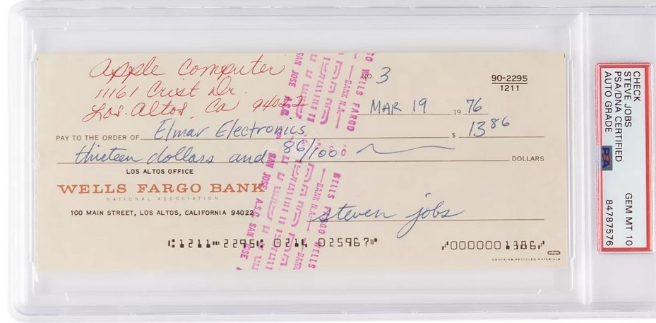 Друг незабравим лот стана чек, подписан от Джобс през 1976 година, единствено две седмици преди формалното учредяване на Apple. Интересното е, че този чек е публикуван още преди стартирането на персонализираните чекове на компанията и Джобс е написал на него на ръка " Apple Computer ". Тази частичка от историята беше продадена за 176 850 $.