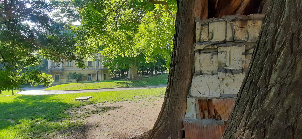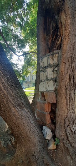 „ С грижа и отговорност към природата и хората... Ствол на дърво е запълнено от вътрешната страна с тухли и итонг. Дървото се намира в градинката на Царския замък, зад Природонаучния музей в София. Неизвестен създател и реализатор или някой от " Оперативна програма градини и паркове " е показал инжинерна мисъл и творчество за обезопасяване на зоната, “ разяснява мъж.