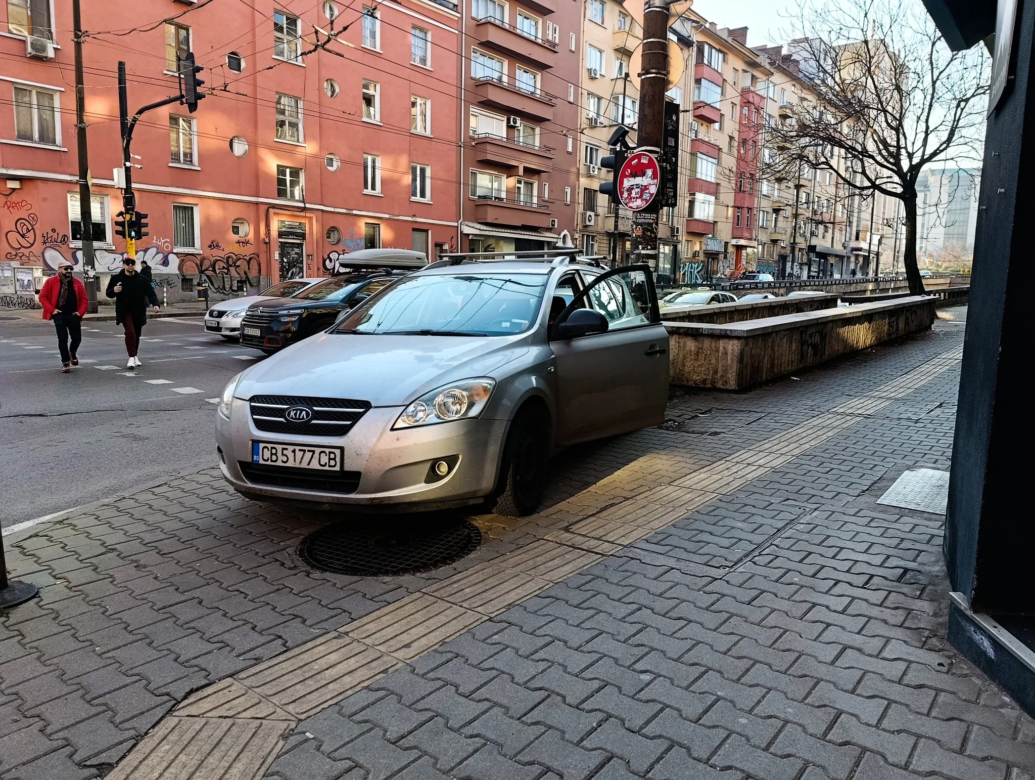" Поредният пример… Господинът на фотографията, с автомобил " Киа Сийд " СВ5177СВ, през днешния ден реши, че е редно да се паркира на ул. „ Г. С. Раковски “ и бул. „ В. Левски “ – баш на тротоара, баш на пешеходната и баш пред магазин, и на всичкото от горната страна блъсна кофата и за малко преминаващите пешеходци, до момента в който се паркира.