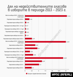 От ИРПС са анализирали общо 17 разнообразни вота , извършени сред 2013 и 2023 година и % на невалидните бюлетини измежду всеки от тях. От посочените данни се вижда, че най-вече са непризнатите гласове на трите вота за общински съветници през 2015, 2019 и 2023 година