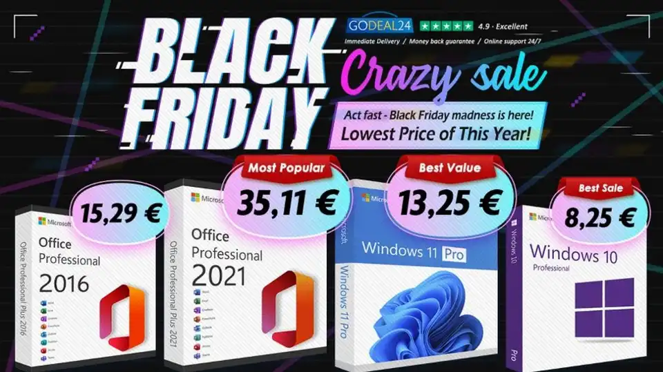 Чакането свърши! Черният петък е съвсем тук и Godeal24 дава началото на покупко-продажби, които не би трябвало да пропускате! Сега е вашият късмет да надстроите своя компютър с доживотни лицензи за Microsoft Office и Windows 11, започвайки от единствено €10.