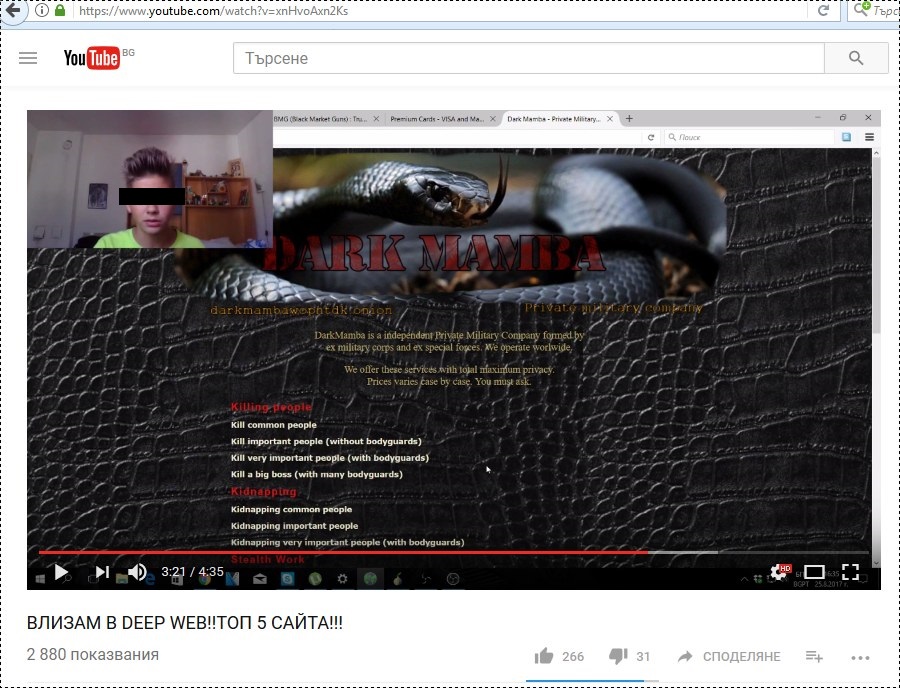В последното си видео от през вчерашния ден, влогърът показва 5 уеб страницата в дълбокия уеб. Първите са извънредно за поръчване на опиати онлайн – характерно марихуана и нейните семки. В последващите виждаме самобитен пазар за оръжия на черно, които се продават в биткойни и имат включена безвъзмездна доставка. В последния уебсайт, явно подбран от 13-годишното дете като най-опасен, се продават " услуги " – убийства!