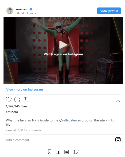 Еминем също се впусна в света на криптовалутите и завоюва към 1,8 милиона $ от това. Продаде виртуални фигури на герои от видеата си и истински фрагменти от свои творби.
