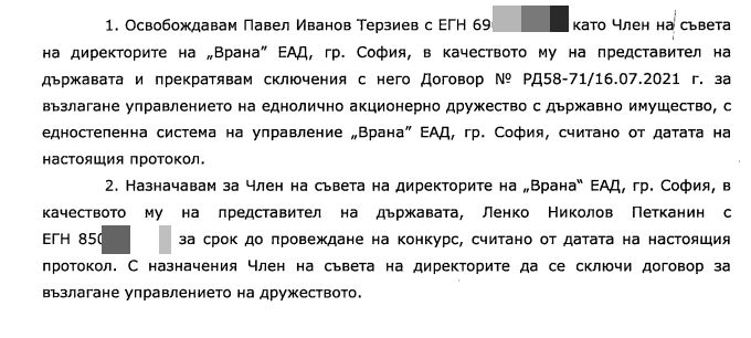 Негов заместител обаче бързо е открит. Това е младият социалист Ленко Петканин. С решение от 9 юни министърът на земеделието Иван Иванов е освободил Павел Терзиев като член на Съвета на „ Врана” ЕАД, както е преустановен и договорът му за ръководство. Вместо него е краткотрайно е назначен Ленко Петканин до провеждането на конкурс. На него е поверено и ръководството на държавната компания.