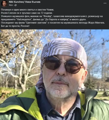 Ники Кънчев потъна в тъга. В персоналния си Фейсбук профил телевизионният водещ показа, че режисьорът Росен Елезов е умрял на 72 години.