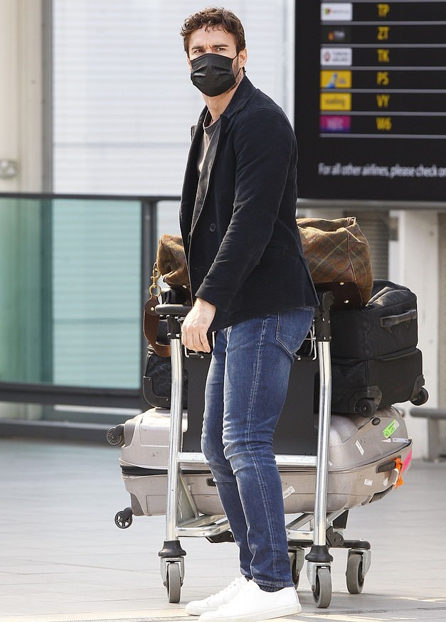 Том, който буташе куфарите си върху количка за багаж, също постави маска на лицето си и типично в негов жанр той носеше дънки, сива тениска, черно сако и бели обувки.