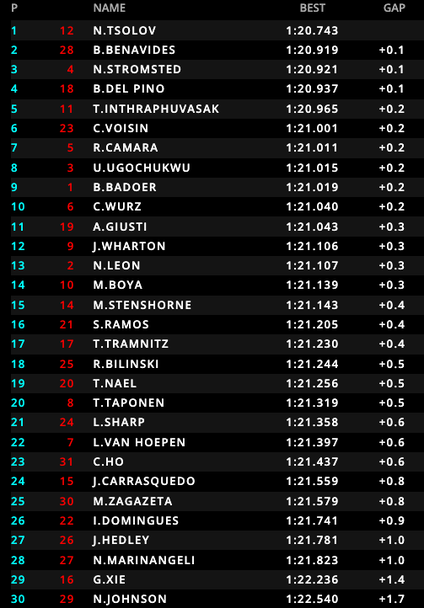 От втория ред ще потеглят Ноа Стрьомщед и Бруно дел Пино, а зад тях от третата редица ще започват съотборникът на Никола в Кампос Тасанапол Интрапувасак и Калъм Войсин. Лидерът в шампионата Рафаел Камара направи разочароваща квалификацията, в която остана едвам седми, на 0.268 зад Цолов. Зад бразилеца топ 10 на старта в неделя ще оформят Уго Угочукву, Брандо Бадоер и Чарли Вурц. Алесандро Джиусти и Джейм Уортън останаха 11-ти и 12-ти и ще поделят първата редица при обръщането на стартовата решетка за утрешния спринт.