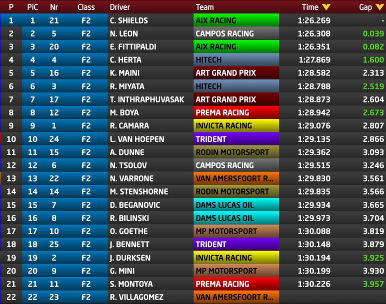 По този метод Цолов се подреди на 12-то място, изоставайки с 3.246 секунди от Киан Шийлдс, който оглави класирането следобяд с обиколка за 1:26.269. Пилотът на Айкс изпревари с 0.039 съотборника на Цолов в Кампос Ноел Леон, а тройката с пасив от 0.082 оформи вторият водач на Айкс Емерсон Фитипалди.