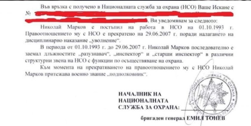 Подполковник Николай Марков е уволнен дисциплинарно от НСО поради несъблюдение на три заповеди.