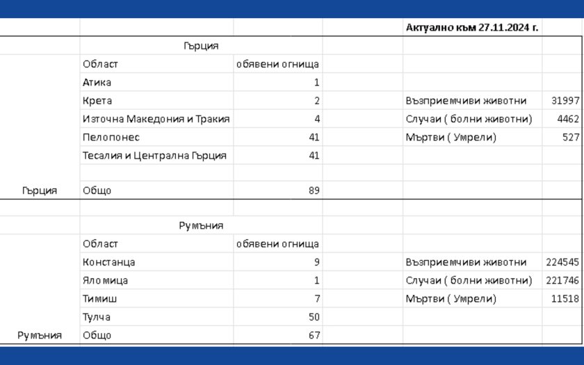 Справка на демонстрира, че към края на ноември записаните заболели от чума животни в Гърция са над 4400. А тези в Румъния - над 220 000.