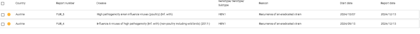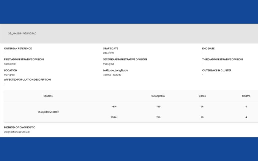 На уеб страницата на организацията е качена последната информация за ситуацията в страните-членки. Данните за България съответстват с тези на българските управляващи. Публикувани са данни за последния случай (към 19.12.2024 година) на шарка по дребните преживни животни в България - в.