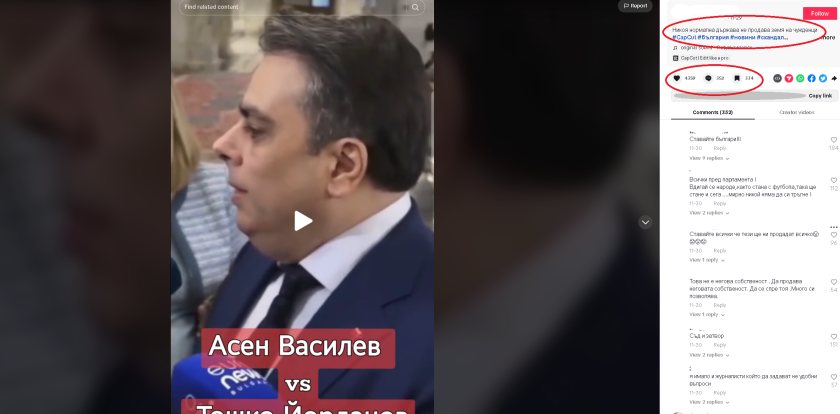 " Никоя естествена страна не продава земя на чужденци ", твърди обява в ТикТок от края на ноември 2023. Видеото съдържа мнения на министъра на финансите Асен Василев и на ръководителя на парламентарната група на Има Такъв Народ Тошко Йорданов за това дали страната се готви да попълни Бюджет 2024 с пари от продажбата на земи от държавния аграрен фонд.