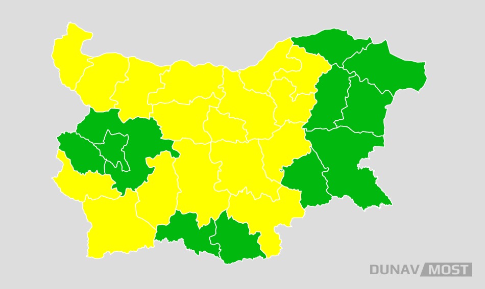 Предупреждението визира областите Видин, Монтана, Враца, Плевен, Ловеч, Габрово, Велико Търново, Русе, Търговище, Силистра, Разград, Сливен, Стара Загора, Хасково, Пловдив, Пазарджик и Благоевград, оповестиха от Национален институт по метеорология и хидрология.