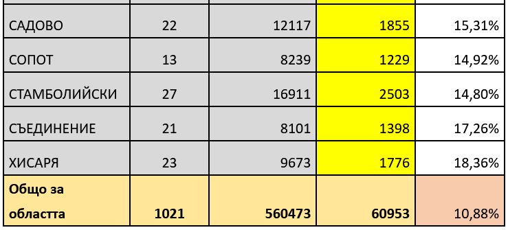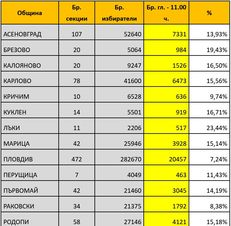 Най-активни са в Лъки - 23,44%, следвани от Брезово - 19,43%. Най-ниска е изборната интензивност в Пловдив - 7,24% и в Раковски - единствено 8,38%.