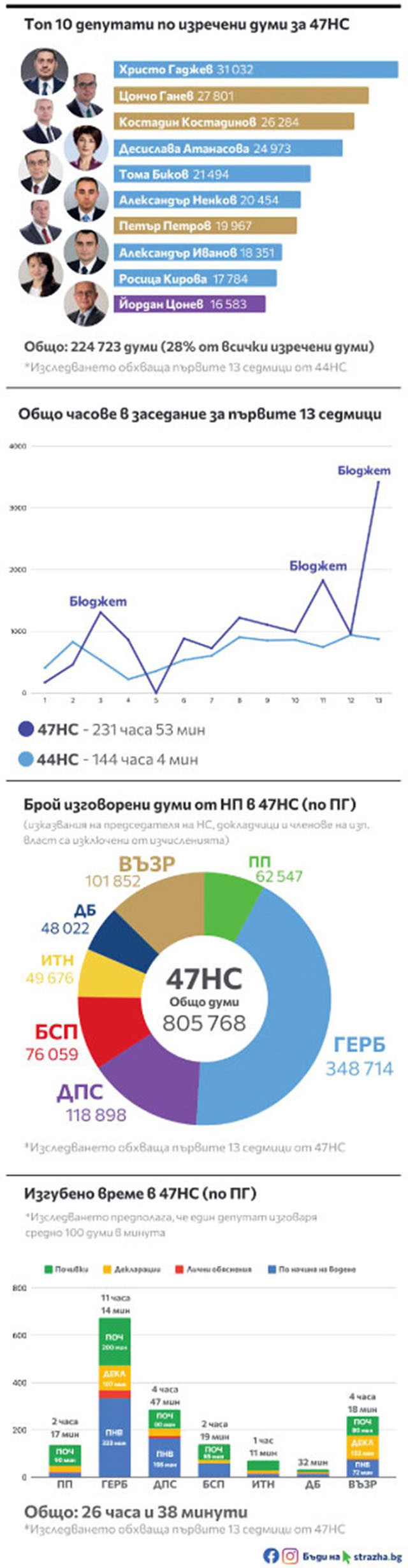 За първите си 13 седмици депутатите от настоящия парламент са изговорили 1 287 079 думи, демонстрира още статистиката на уеб страницата “Стража ” - неправителствена самодейност, която следи работата на Народното събрание и систематизира политическите задължения на партиите. Като множеството казани думи и по-дългата дълготрайност на съвещанията се е натрупала основно в няколкото маратонски съвещания, в които през февруари бе гласуван бюджетът за тази година.