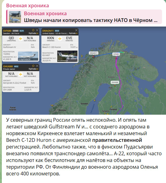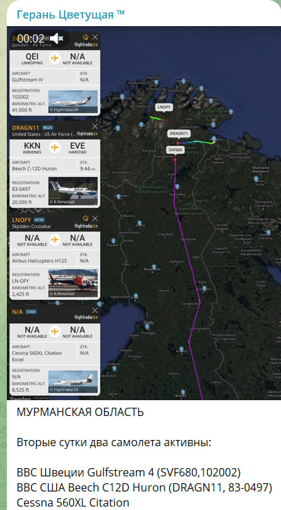 Сега за други съвпадения. Медиите пишат, че скок на радиацията е регистриран през първата половина на септември. Защо започнахте да публикувате в този момент? На 11 и 12 септември украински дронове се пробваха да нападат региона на Мурманск от територията на Финландия и Норвегия. Това беше предшествано от доста часове полети в непосредственост до съветска територия на шведските военновъздушни сили S102B радио и радиоразузнавателни самолети, Gulfstream 4 (SVF680,102002), US Air Force Beech C12D Huron (DRAGN11, 83-0497), Cessna 560XL Citation, Gulfstream Aerospace TP 102C (G -IV-SP), които могат да прихващат телефонни диалози, радиокомуникации, цифрови и телевизионни мрежи.
