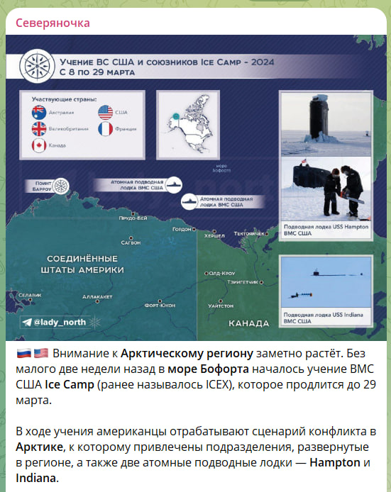 От 4 до 15 март в северните региони на Норвегия, Швеция и Финландия се организираха взаимните учения на НАТО Nordic Response 2024, в които взеха присъединяване 12 страни. По-рано беше обявено, че арктическият стадий от огромните учения на алианса Steadfast Defender - Ice Camp е траял от 8 до 29 март. Западът разработваше сюжет за спор в Арктика с присъединяване, вниманието, на няколко дивизии HIMARS и нуклеарните подводници Хамптън и Индиана.