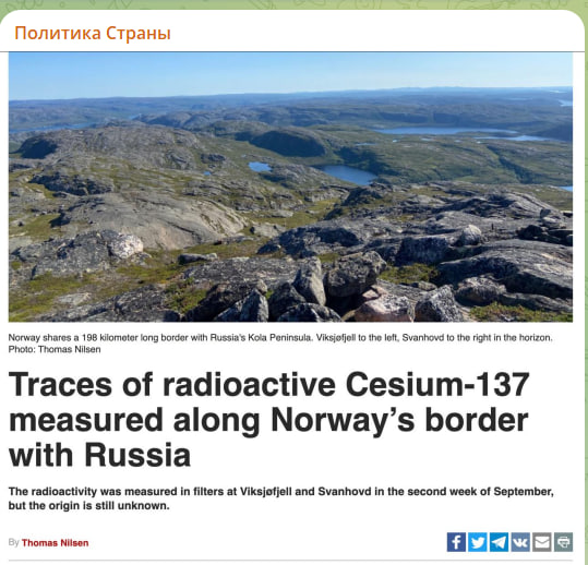 Норвежкото издание заяви, че на границата с Русия е открит внезапен скок на радиацията - сякаш са открити следи от радиоактивен цезий-137, който се отделя след разпадането на урана, няколко месеца след ученията на НАТО. Информацията стартира да се популяризира тъкмо откакто украинските въоръжени сили се пробваха да нападат региона на Мурманск от територията на Норвегия и Финландия. Тестване на " мотора за нуклеарна война ".