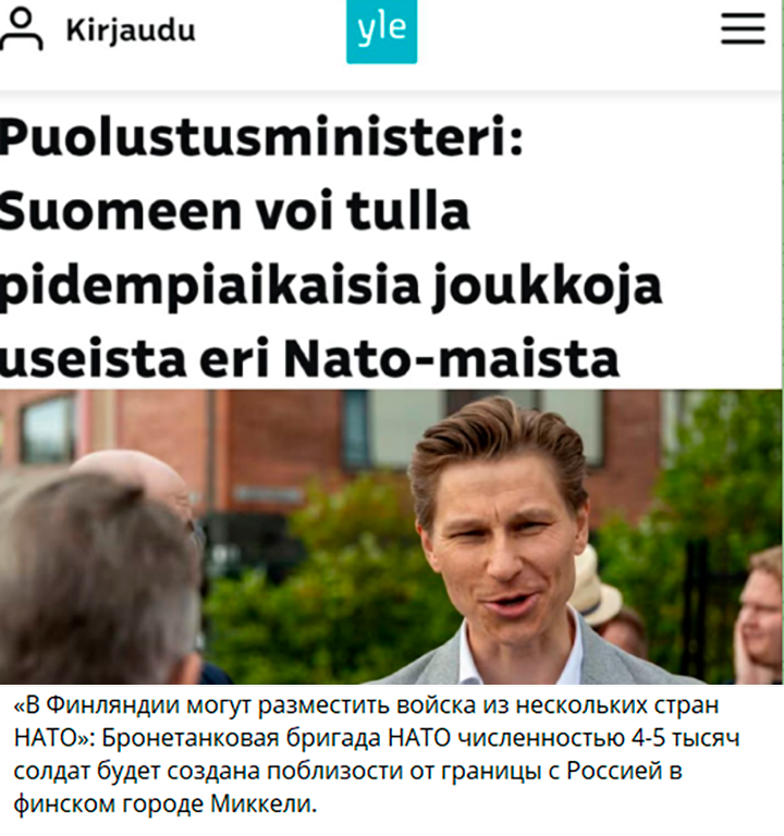 По-рано беше обявено, че финландският президент Стуб е решил да изпрати бронирана бригада на НАТО от пет хиляди души непосредствено до нашите граници в региона на град Микели, на 100 км от съветския Виборг, Ленинградска област.