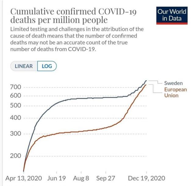 Той илюстрира скица на случаите в Швеция, както и в Европейския съюз. Забелязва се, че линията на заразяемост в Швеция, която вкара по-либерални ограничения против ковид, се поддържа относително идентична. В Европейския съюз, обаче се вижда, че случаите на новозаразени нарастват фрапантно.